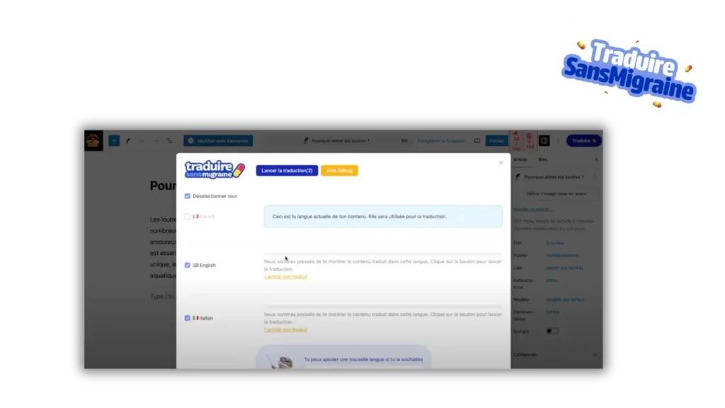 O « Traduire sans migraine » mantém os títulos, tags, links e formatação, evitando erros frequentes das traduções automáticas. Ideal para ganhar tempo e manter uma versão multilíngue limpa e coerente.