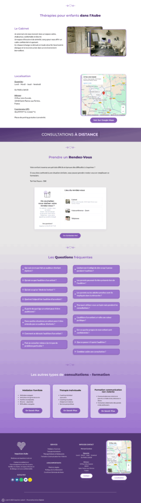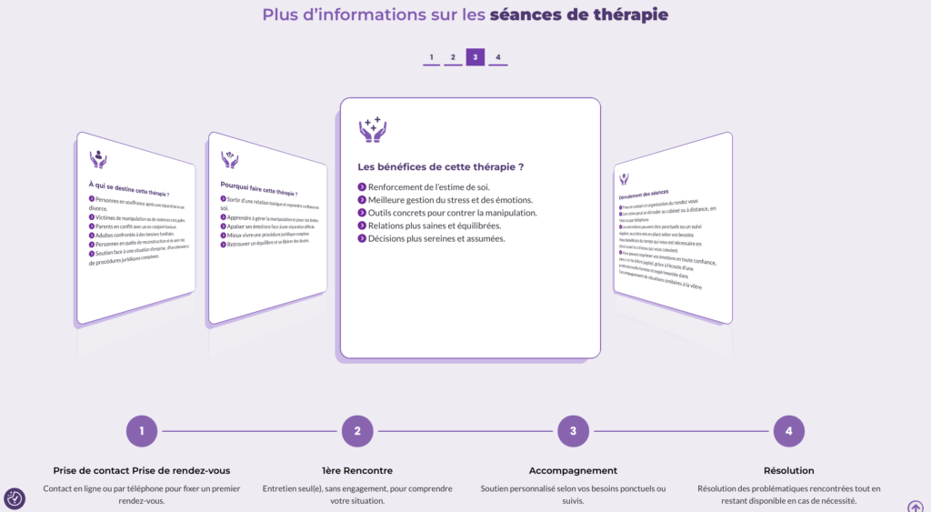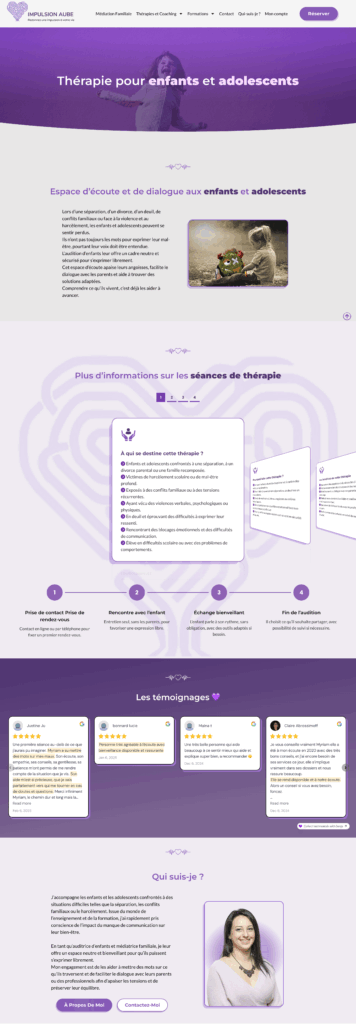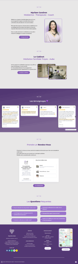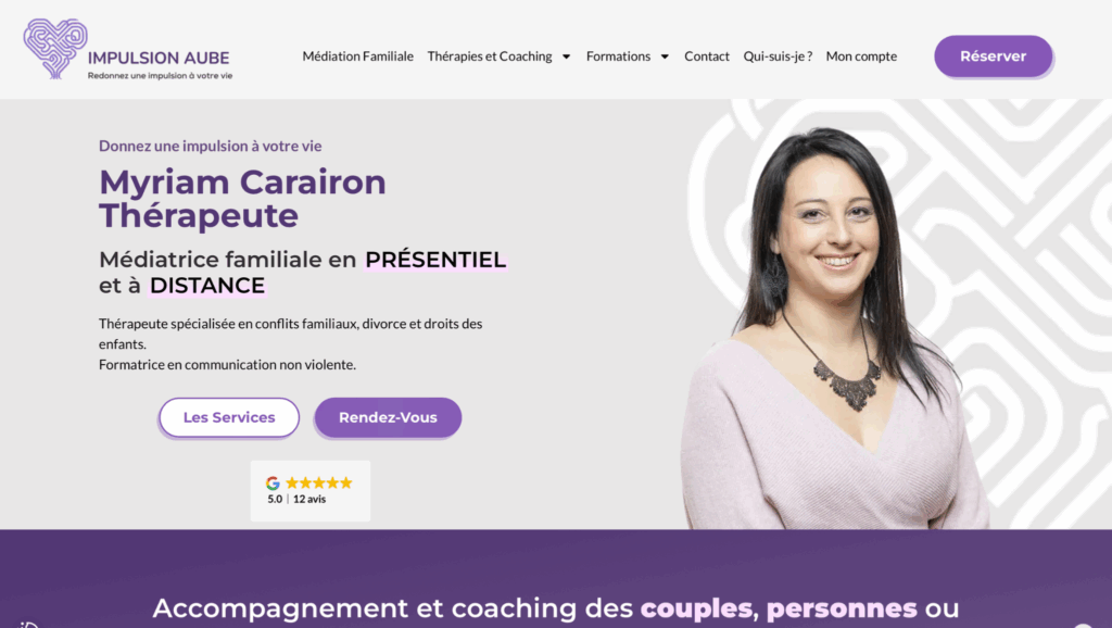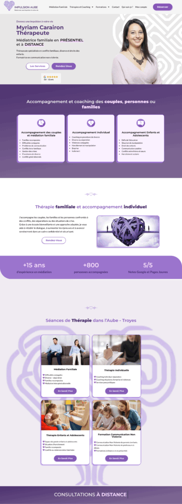 Este site foi criado para a Myriam Carairon, mediadora familiar e formadora especializada em comunicação não violenta. Acompanha crianças, casais e famílias em contextos delicados (separações, conflitos, rupturas de diálogo), presencialmente ou à distância.