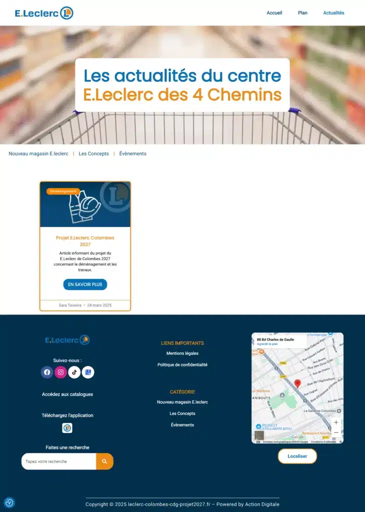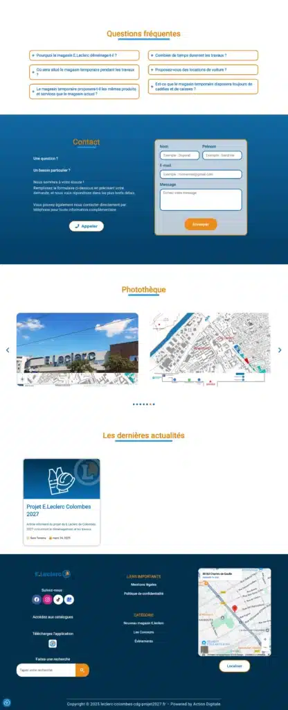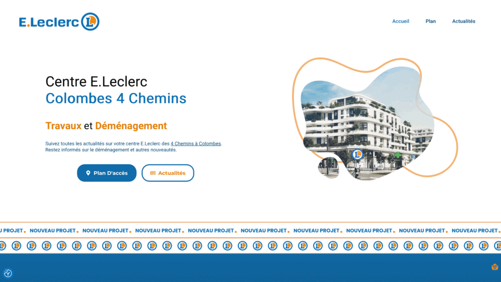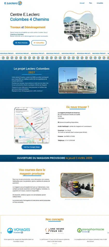 Este site foi criado para o Leclerc em França, com o objetivo de informar os clientes sobre a mudança de loja e o andamento das obras.