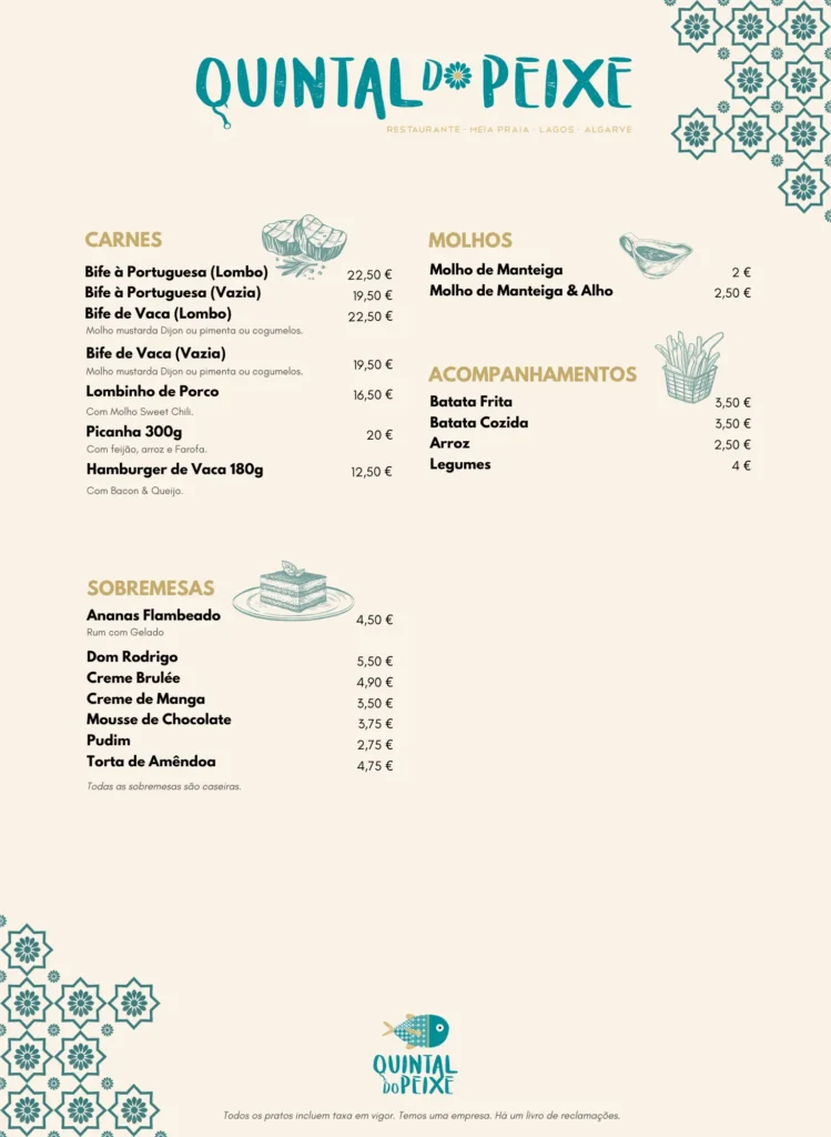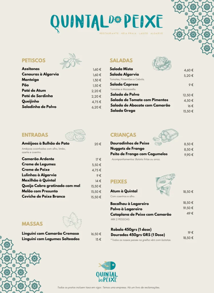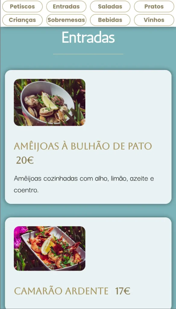 Seções claras: entradas, pratos, sobremesas, bebidas, acompanhadas de descrição, preço e, opcionalmente, informações nutricionais ou alergénios.