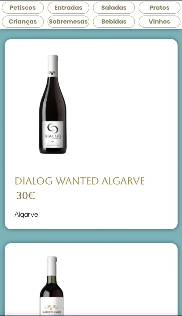 Fotografias dos pratos e das garrafas integradas à ementa, valorizando a apresentação dos produtos.