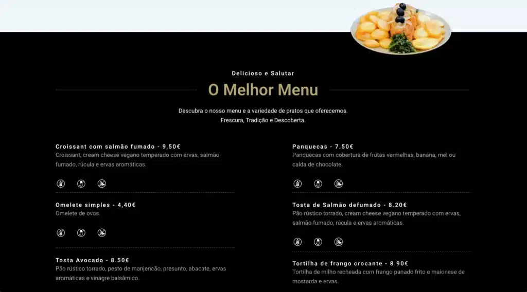 Este site foi criado para um novo restaurante que se destaca pela sua preocupação com o bem-estar dos clientes: oferece pratos sem alergénios e valoriza tanto os sabores locais como os gostos internacionais — atraindo turistas e habitantes da região.